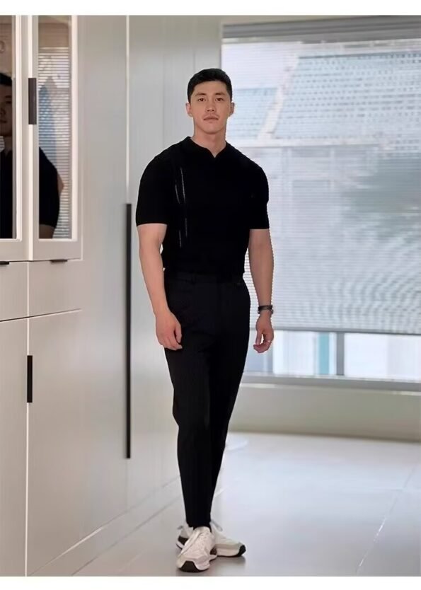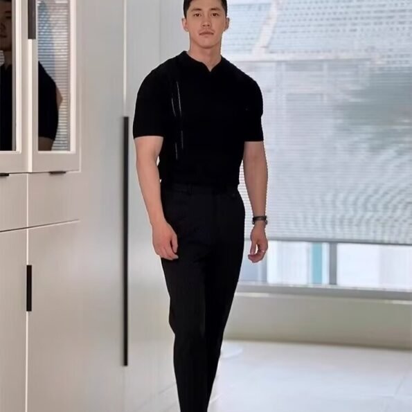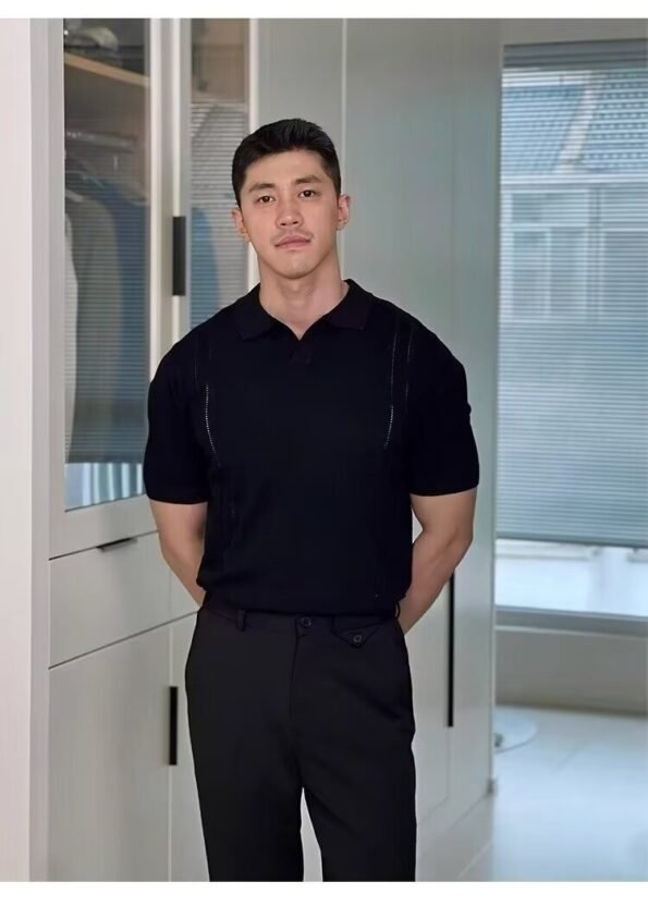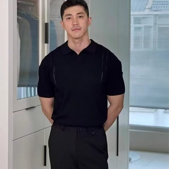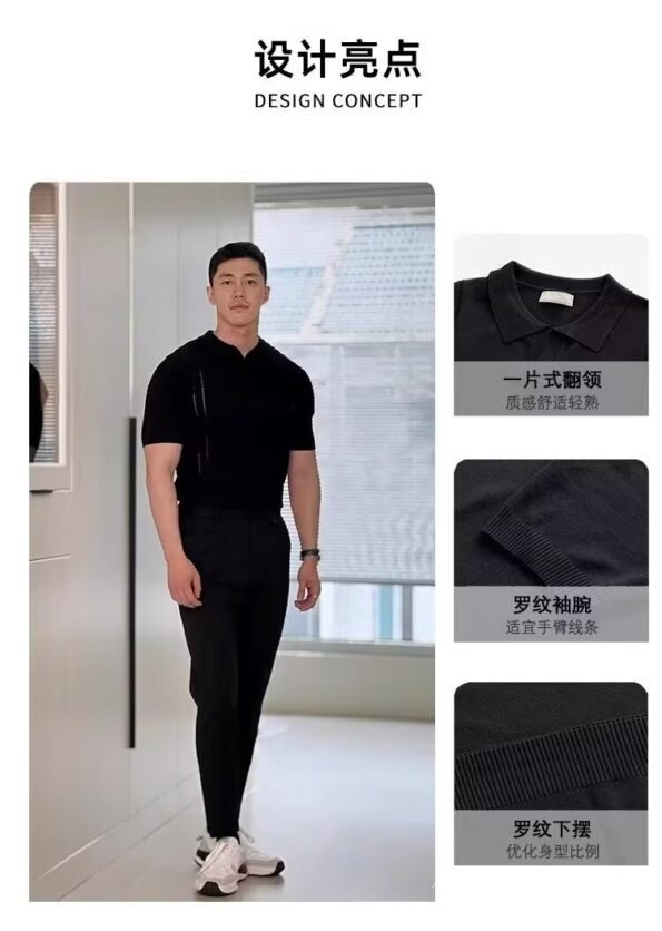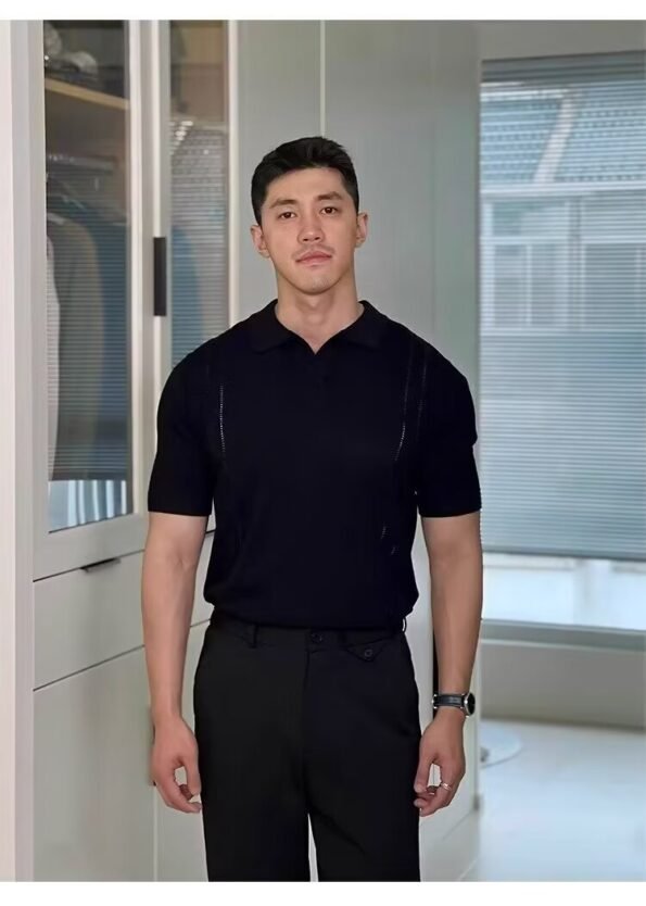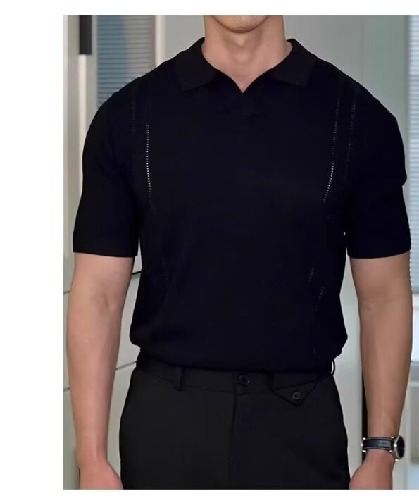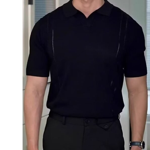 Senior casual lapel short-sleeved men’s British retro hollow breathable knitted POLO shirt classic solid color T-shirt top